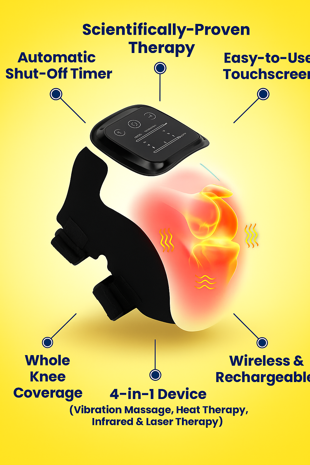 Pro Knee-care Massager uses a combination of heat, vibration, and red light therapy to increase blood flow, reduce inflammation, and ease joint stiffness, providing effective pain relief and improved mobility.